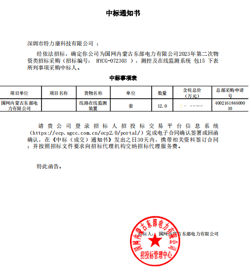 經(jīng)依法招標(biāo),確定我司為國(guó)網(wǎng)內(nèi)蒙古東部電力有限公司2023年第二次物資類(lèi)招標(biāo)采購(gòu)(招標(biāo)編號(hào): HYCG -072303 ),測(cè)控及在線監(jiān)測(cè)系統(tǒng)包15下表所列事項(xiàng)采購(gòu)中標(biāo)人。中標(biāo)通知如下:
