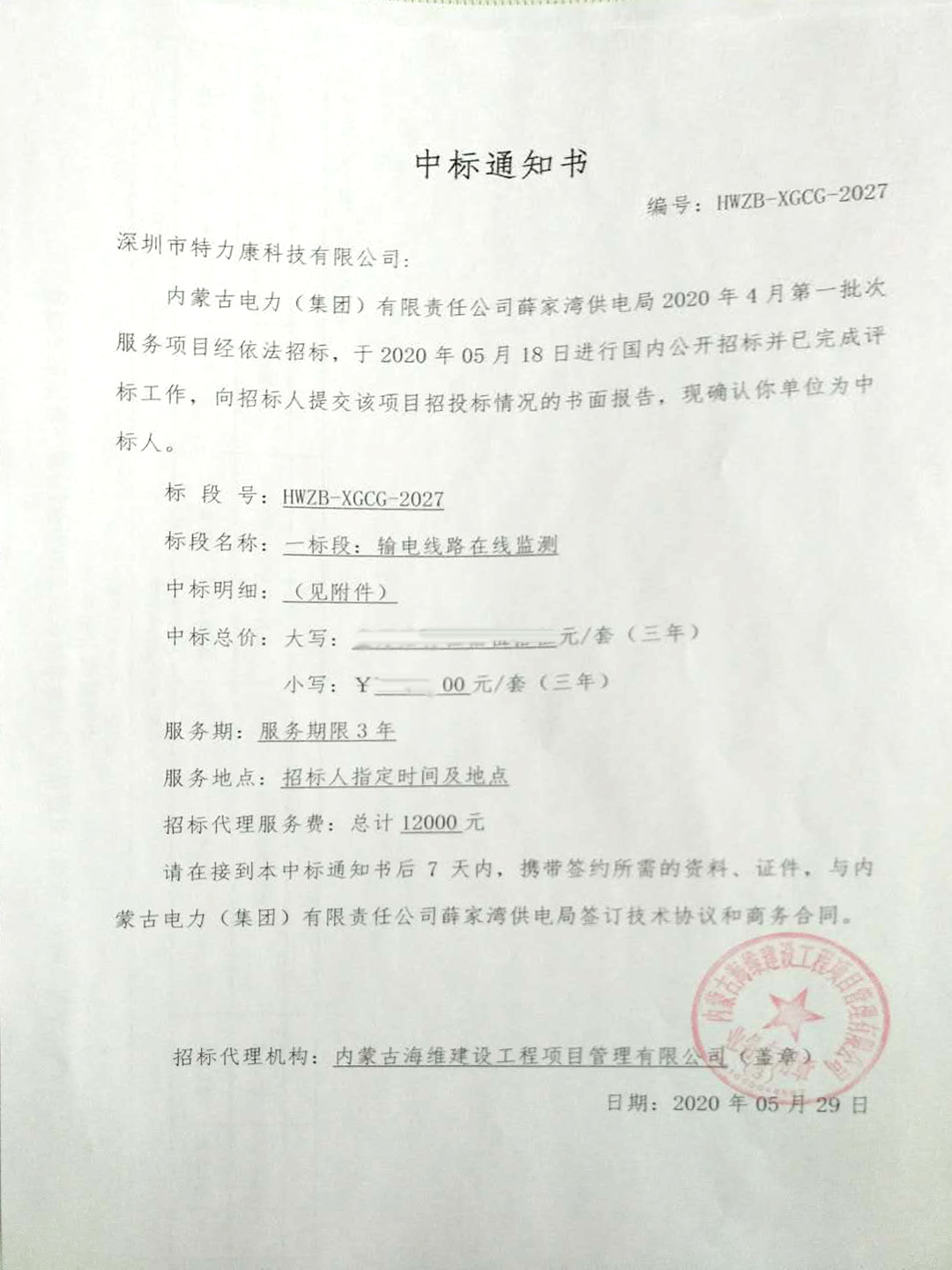 內蒙古電力(集團)有限責任公司薛家灣供電局2020年4月第一批次服務項目(一標段:輸電線路在線監(jiān)測)經依法招標,于2020年05月18日進行國內公開招標并已完成評標工作,向招標人提交該項目招投標情況的書面報告,現(xiàn)確認我司(深圳市特力康科技有限公司)為中標人。特發(fā)中標通知書,如下: