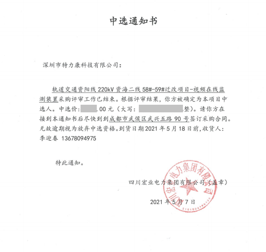 軌道交通資陽(yáng)線220kV資海二線58#- 59#遷改項(xiàng)目一視頻在線監(jiān)測(cè)裝置采購(gòu)評(píng)審工作已結(jié)束。根據(jù)評(píng)審結(jié)果,我司被確定為本項(xiàng)目中標(biāo)人,中標(biāo)通知如下: