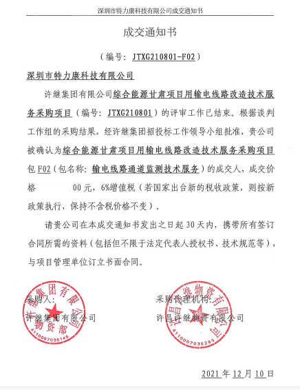 許繼集團(tuán)有限公司綜合能源甘肅項(xiàng)目用輸電線路改造技術(shù)服務(wù)采購(gòu)項(xiàng)且(編號(hào): JTXG210801) 的評(píng)審工作已結(jié)束。根據(jù)談判工作組的采購(gòu)結(jié)果,經(jīng)許北集團(tuán)招投標(biāo)工作領(lǐng)導(dǎo)小組批準(zhǔn)。我司被確認(rèn)為綜合能源甘肅項(xiàng)目用輸電線路改造技術(shù)服務(wù)采購(gòu)項(xiàng)目包F02(包名稱:輸電線路通道監(jiān)測(cè)技術(shù)服務(wù))的成交人,成交通知如下: