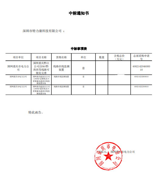 我司(深圳市特力康科技有限公司)中標(biāo)國網(wǎng)重慶市電力公司2023年第二次物資公開招標(biāo)采購-線路在線監(jiān)測裝置-可視化(架空),中標(biāo)通知如下: